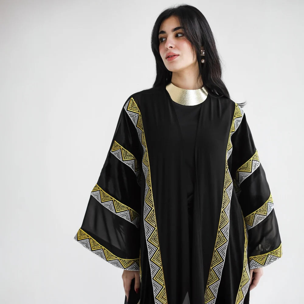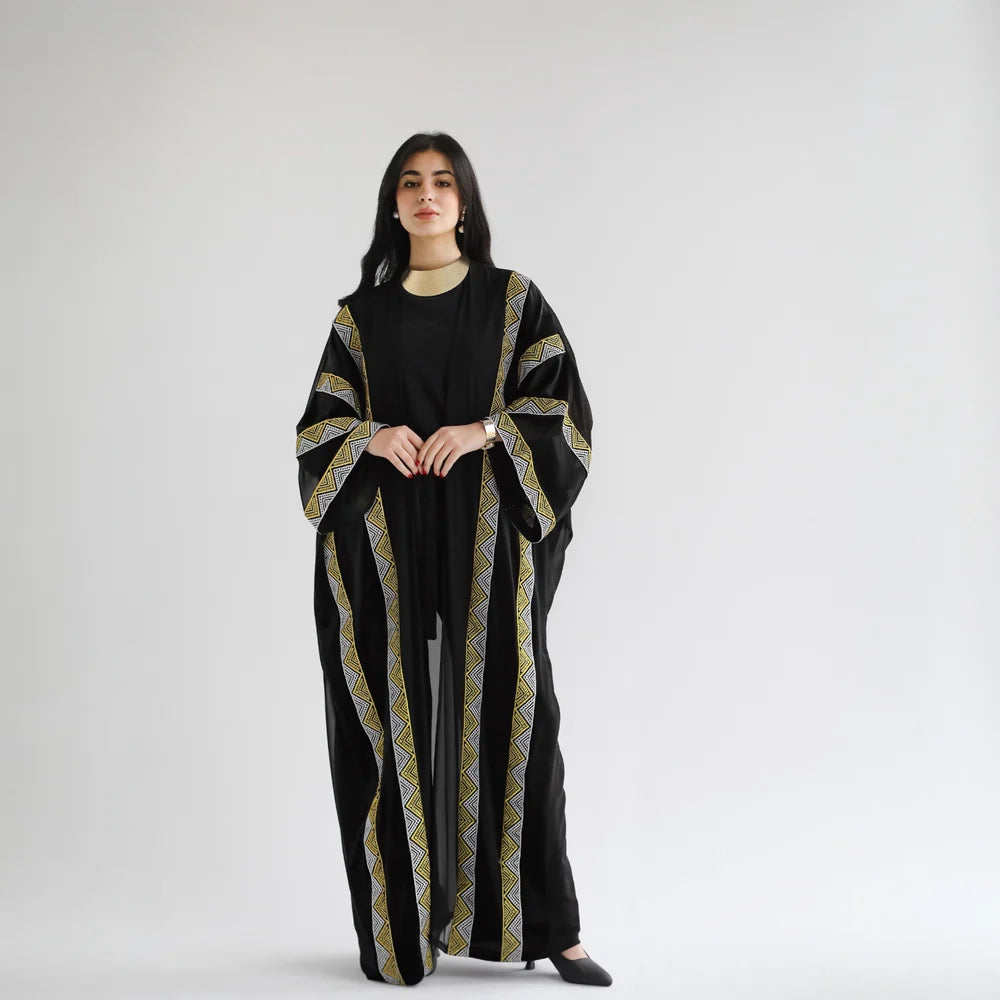 Elevate your wardrobe with this exquisite chiffon and velvet bisht kaftan, a timeless piece that seamlessly blends traditional elegance with contemporary sophistication. The luxurious combination of flowing chiffon and sumptuous velvet creates a striking visual contrast, while the classic bisht silhouette offers graceful draping and effortless refinement. Perfect for special occasions, celebrations, or whenever you desire to make a distinguished impression. Crafted with meticulous attention to detail, this kaftan embodies the artistry and heritage that defines Farawlaya's curated collection.