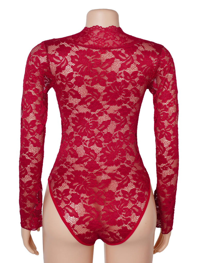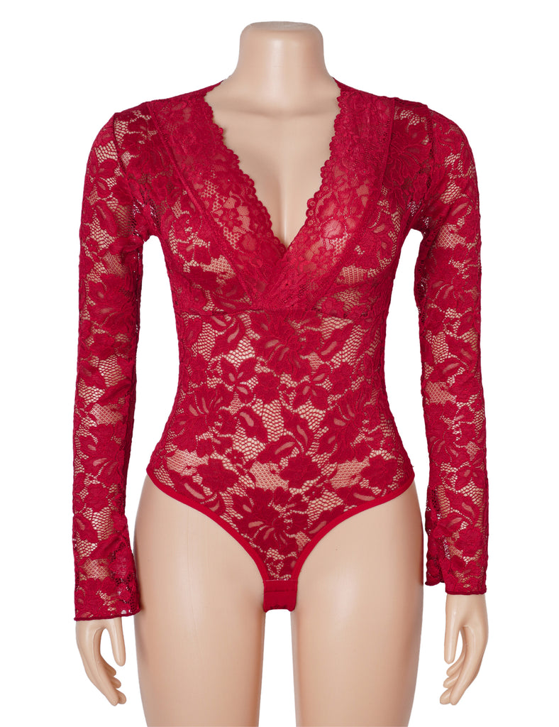 Elegant lace bodysuit featuring a flattering V-neckline and long sleeves for sophisticated coverage. The delicate lace design offers a sensual aesthetic while the crotchless cut provides convenience and comfort. Perfect for intimate occasions or layering under sheer pieces. Crafted for a luxurious feel against the skin.