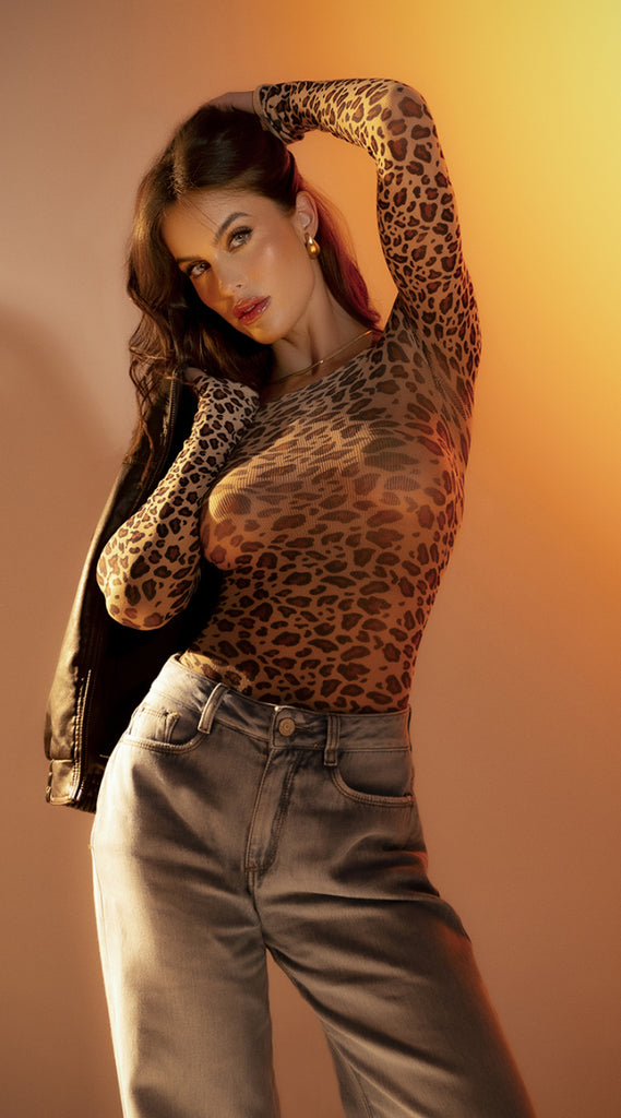 Embrace bold elegance with this striking leopard print mesh bodysuit. The long sleeves and form-fitting silhouette create a sophisticated statement piece perfect for layering or wearing solo. Crafted from breathable mesh fabric, it offers a modern edge to your wardrobe while maintaining refined style. Versatile enough for evening outings or fashion-forward casual wear, this bodysuit seamlessly transitions from day to night. An essential addition to any contemporary collection.