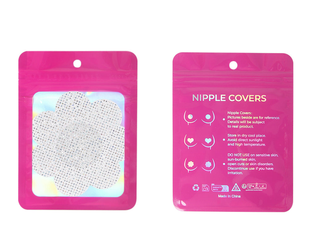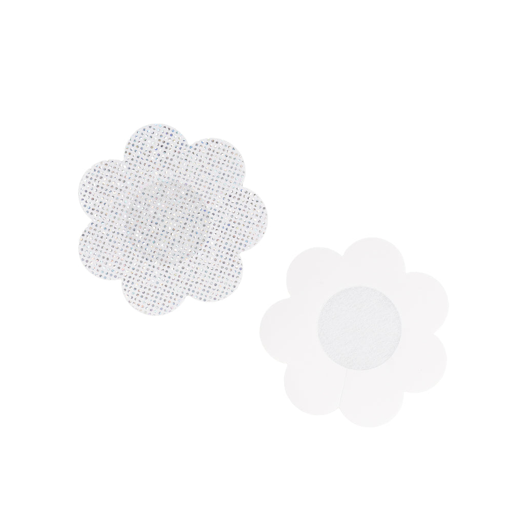 Elegant white flower-shaped nipple covers with a shimmering laser finish. Perfect for special occasions, festivals, or creative styling. The delicate floral design offers a sophisticated look while providing comfortable coverage. Lightweight and easy to apply, these eye-catching covers add a touch of glamour to any outfit. Ideal for performances, parties, or fashion-forward wear.