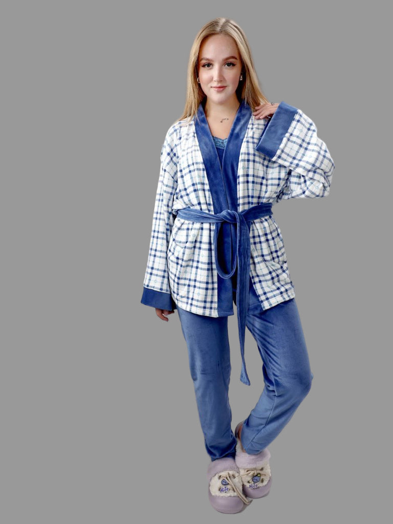 Women's elegant winter pajamas, T-shirt, pants, and short robe