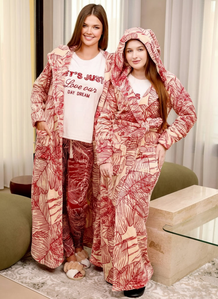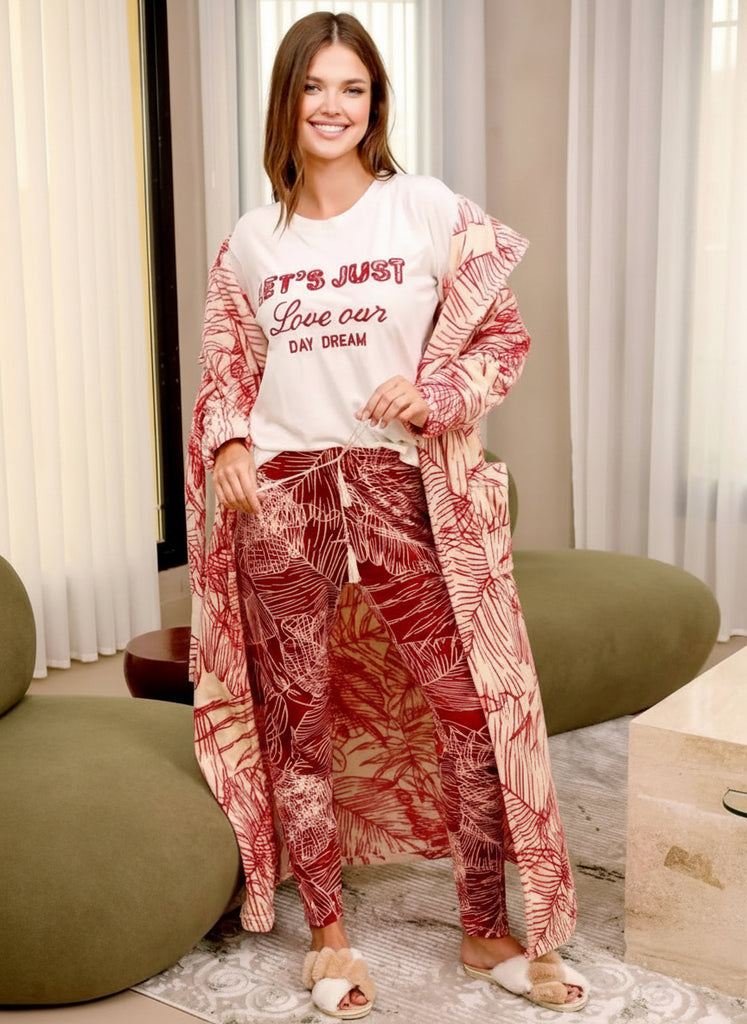Wrap yourself in comfort this winter with our cozy three-piece pajama set designed for restful nights. This complete ensemble includes a soft T-shirt, comfortable pants, and a luxurious long robe—everything you need for ultimate relaxation. Perfect for layering on chilly evenings or lounging at home, each piece is crafted to keep you warm while maintaining breathable comfort. Whether you're winding down after a long day or enjoying a leisurely morning, this versatile set supports your self-care routine with style and warmth. Discover the perfect balance of coziness and elegance with Farawlaya.
